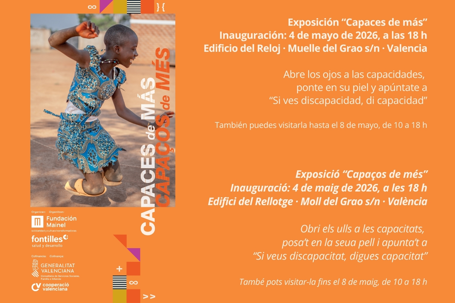 «Capaces de más» se inaugura el 4 de mayo de 2026, a las 18h. en el Edificio del Reloj de Valencia. Después, se podrá visitar hasta el 8 de mayo, de 10 a 18 horas.