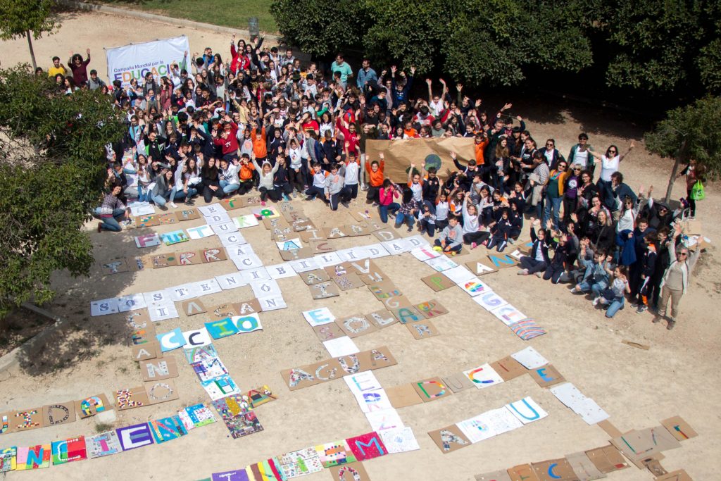 La coalición valenciana de la Campaña Mundial por la Educación (CME) ha reunido un año más a las comunidades educativas de los centros donde trabajan para realizar el acto central de la Semana de Acción Mundial por la Educación. En esta edición la cita ha sido en el Jardín del Turia, a la altura del Puente del Real, donde más de un centenar de estudiantes de cinco colegios e institutos han jugado una partida de Scrabble gigante, entrelazando palabras por la educación y por el planeta. Para jugar, han utilizado las letras que ellos mismos han fabricado en sus aulas con materiales reciclados.